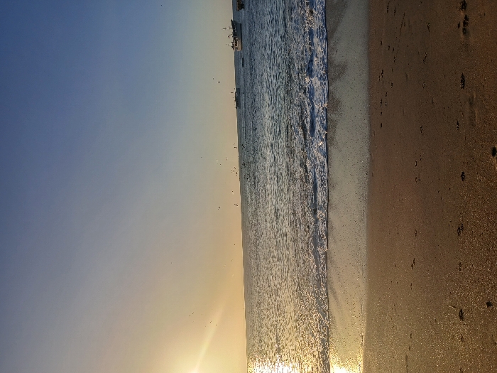 The photograph captures a serene beach scene, oriented vertically. On the right, the sand stretches upward, its surface marked with dark footprints. To the left, waves gently roll towards the shore, their crests catching the sunlight. The clear sky occupies the upper left portion of the frame, transitioning to a bright glow near the bottom center, suggesting the sun is rising or setting. A few faint silhouettes of distant boats are visible near the top edge, enhancing the sense of distance.