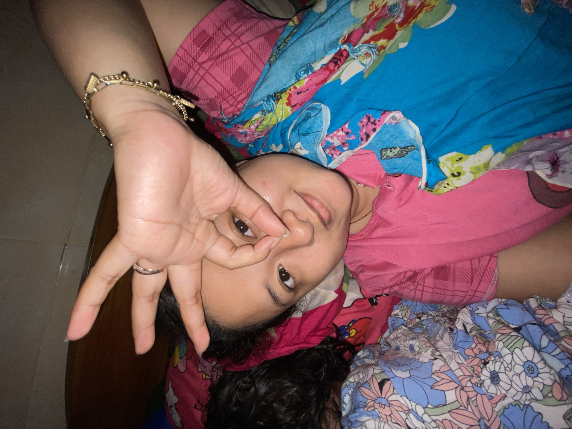 An adult female is depicted lying indoors in Gelam, Indonesia. She is positioned facing the camera, with her head resting on pink patterned bedding. Her dark, curly hair is visible on the left. She wears a pink short-sleeved garment. Her right hand, adorned with a silver-colored ring on the ring finger, is raised and positioned over her right eye, with the thumb and index finger forming a circle. Her remaining fingers are extended. A gold-colored bracelet with multiple charms is on her right wrist. She exhibits a slight smile and a direct gaze towards the viewer. A blue fabric with a colorful floral pattern is draped over part of her body. To her left, another blue, white, and pink floral patterned fabric is visible. The background is dark and features an indistinct dark wooden surface in the upper left quadrant.