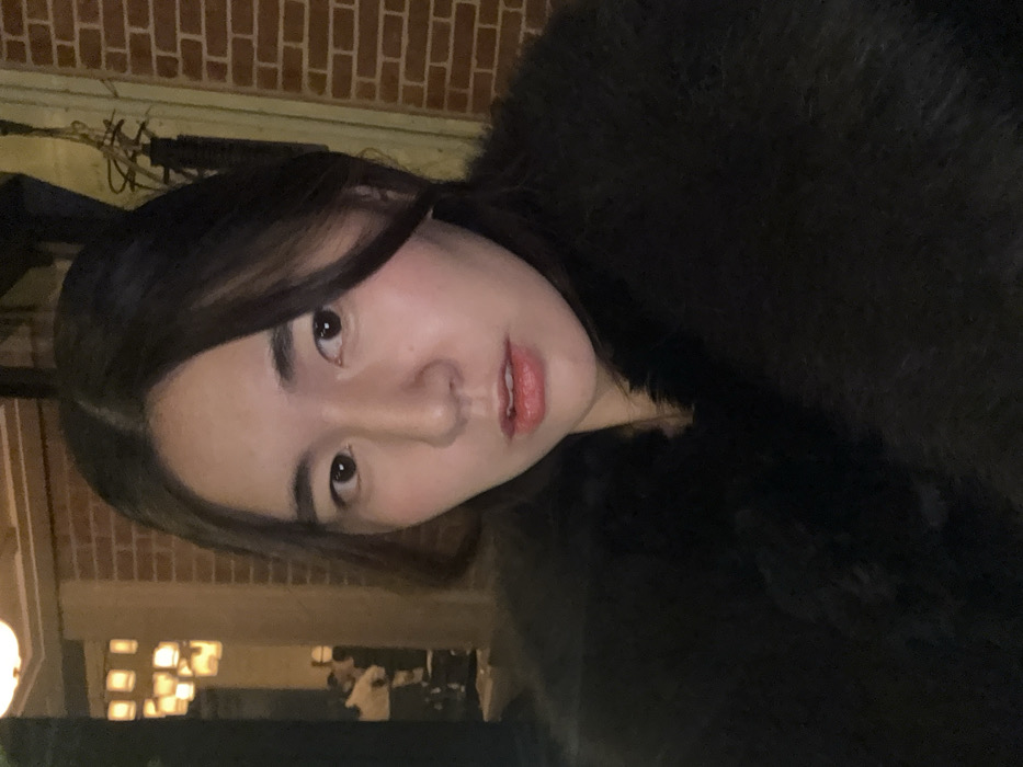 A young woman poses for a selfie, angled slightly. She has fair skin, dark hair parted to the side, and light pink lips. She's wearing a dark, fuzzy garment, likely a coat or jacket. In the blurred background, a brick wall and a dimly lit interior space with tables and people are visible. The overall lighting is soft and warm.