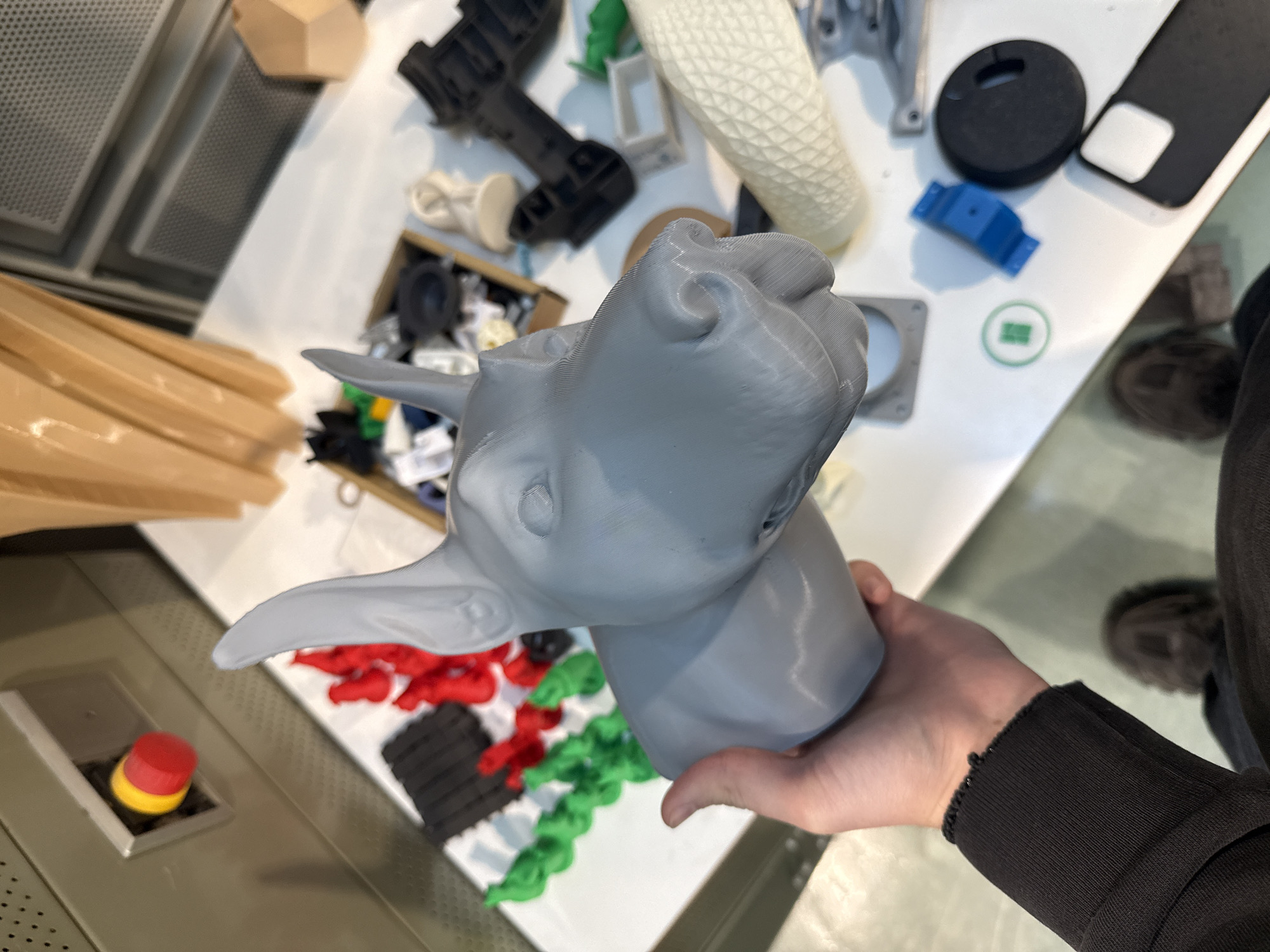 A first-person, downward-angled photograph depicts an individual's left hand holding a light gray, 3D-printed dog bust in a workshop or laboratory environment in Vaasa, Finland. The bust features a dog's head with upright ears and a prominent snout, displaying visible layer lines from the additive manufacturing process. The hand is covered by a black long-sleeved garment with a frayed cuff. The background consists primarily of a white tabletop laden with various objects. On the left side of the table, a white tray holds multiple small 3D-printed figures: a row of approximately eight green, abstract humanoid shapes, and a parallel row of eight red, similar shapes. Several black, block-like 3D prints are also on the tray. A small cardboard box containing miscellaneous components is situated behind these figures. To the right of the dog bust, a variety of other 3D-printed items are visible: a white cylindrical object with a diamond-patterned texture, a black multi-part assembly, a small blue perforated piece, and a black circular disc. Near the bottom right, a black smartphone with a white square on its back is resting on the table next to a small green and white circular sticker. In the upper left background, an olive-green or gray panel with an integrated red and yellow emergency stop button is present, suggesting the presence of machinery. Above the tabletop in the background, curved, light brown structures, possibly made of wood or composite material, are partially visible. The individual's blurred dark shoes and lower legs are visible at the bottom of the frame against a dark floor. The scene is brightly and evenly lit.