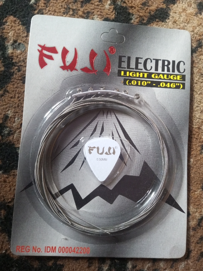 pack of Fuji Electric light gauge (.010"-.046") guitar strings. The packaging is gray with a red "Fuji" logo and a depiction of a mountain range in the lower half. The strings are coiled inside a clear plastic bubble, along with a white guitar pick labeled "Fuji 0.50mm". "REG No. IDM 000042200" is printed near the bottom.