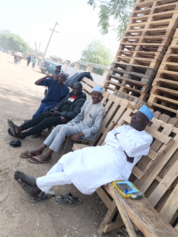 The image depicts an outdoor scene in Tudun Wada, Nigeria, characterized by dry, reddish-brown dirt ground under a bright sky. Five adult males are visible. Four men are seated on makeshift benches constructed from wooden shipping pallets, which are also stacked high to the right of the frame. The man on the far right, dressed in a white tunic and a light blue traditional cap, is reclining with his arms crossed and eyes closed or downcast. A yellow pouch containing a mobile phone and a pen rests beside him on the pallet bench. To his left, a man wearing a light grey tunic with embroidery and a matching light blue cap sits upright, looking towards the viewer. Next to him, a man in a dark jacket with red and white accents over a dark shirt and black trousers holds a dark object, likely a mobile phone, while also looking towards the viewer. The leftmost seated man, dressed in a dark blue tunic and trousers, raises his right hand with an open palm gesture. All seated individuals wear sandals or have them placed near their bare feet. In the background, a dirt road is visible with a person on a motorcycle, several pedestrians, and a parked teal-colored SUV. A utility pole, a fence topped with barbed wire, and sparse trees are also present in the background under the hazy sky.