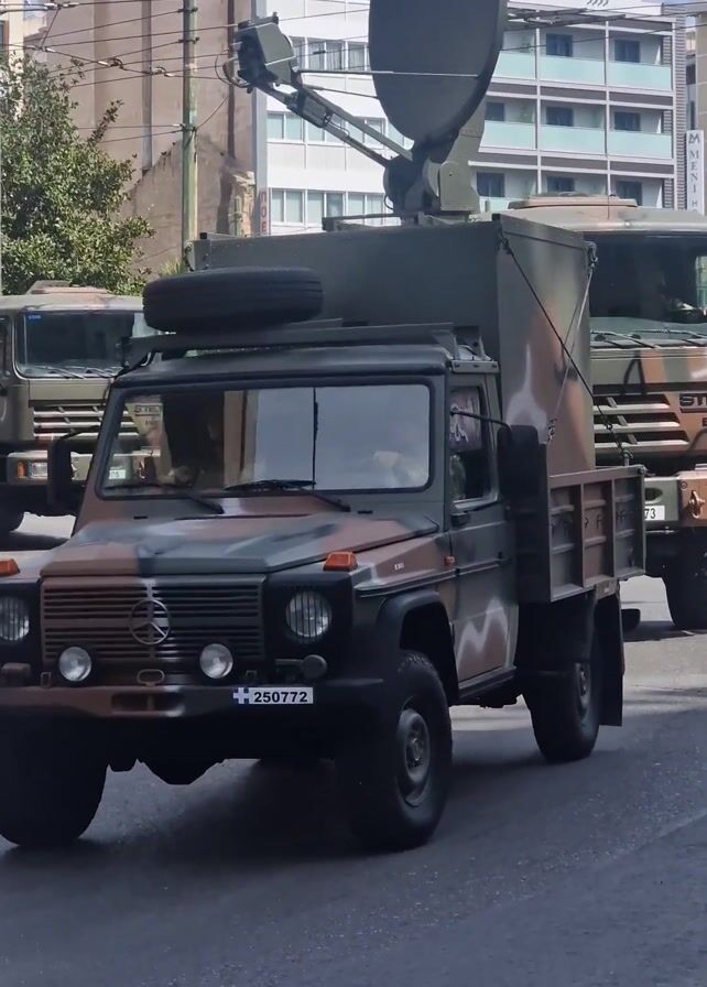 two military vehicles driving on a city street during the day. The first vehicle is a Mercedes-Benz G-Class truck with a camouflage paint job and a satellite dish mounted on the back. A spare tire is visible on the roof. The vehicle has a license plate number of 250772. The second vehicle is a Steyr truck, also with a camouflage paint job. Its license plate number is 229573. Buildings are visible in the background, including a hotel named "HOTEL APARTMENTS". People are standing on the sidewalk near a fountain.