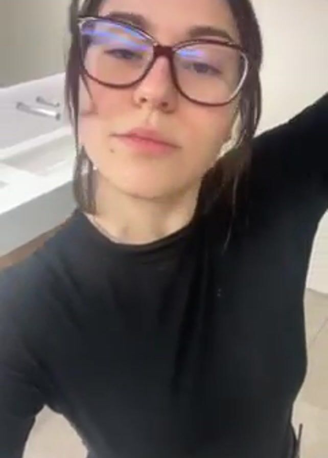 A young woman with dark hair and glasses, wearing a black long-sleeved shirt, is in what appears to be a bathroom or restroom. She is looking directly at the camera and briefly touches her hair. Behind her is a white sink and a mirror. The lighting is bright and artificial.