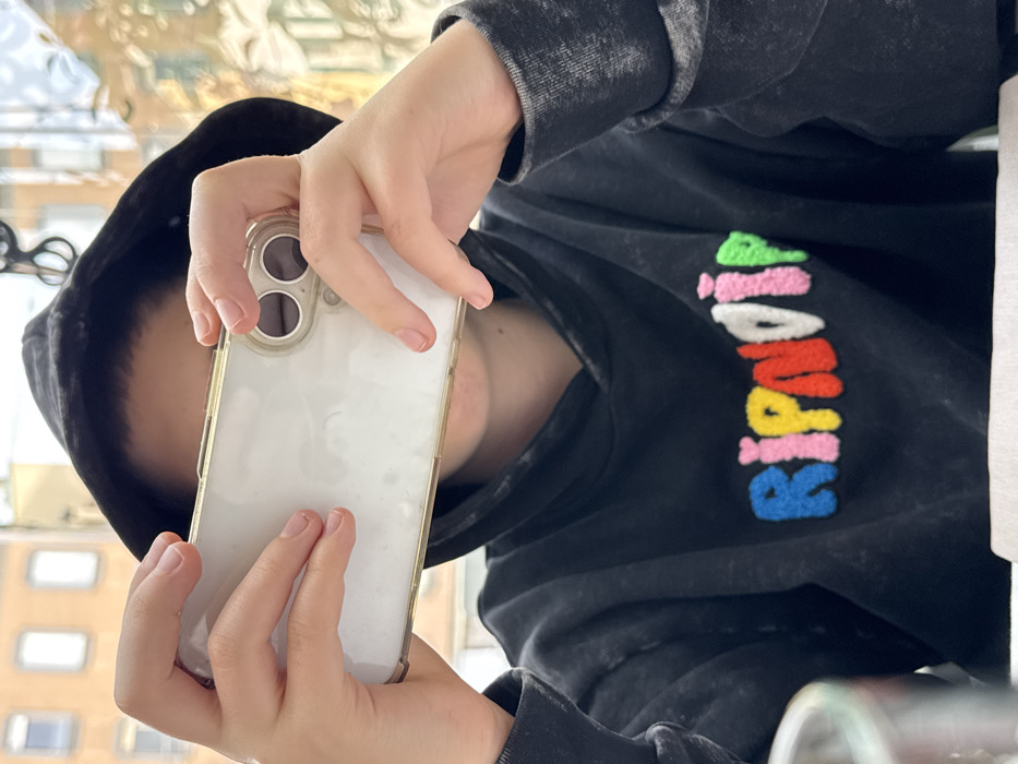 A person, partially obscured, is depicted from the chest up, seated indoors and looking outwards through a window. The individual is wearing a dark, possibly acid-washed or faded black, hooded sweatshirt with the hood drawn over their head. The front of the sweatshirt features textured, multi-colored lettering spelling "RIPNDIP." The person is holding a light-colored smartphone horizontally with both hands, positioned to cover the upper portion of their face. The phone, which appears to be in a clear or translucent protective case, shows two distinct camera lenses on its rear. Only the person's mouth and chin are visible below the phone. In the foreground, a blurred glass object is partially visible on the left, resting on a white surface, likely a table. The background, viewed through a window, displays blurred reflections and indistinct outdoor elements, including a building with rectangular windows and general urban scenery. The specific location within the city of Como, Italy, is not discernible from the visual information provided.