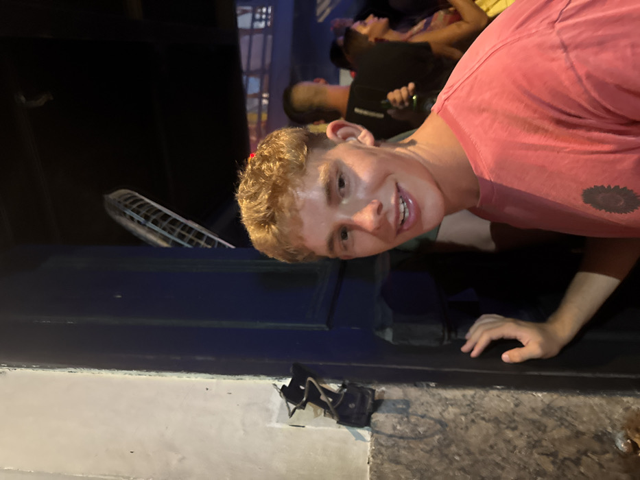 A young man with short, blonde hair and a pink t-shirt peers into the camera with a smile. His hand rests on a dark ledge below him, and part of his arm is visible. In the background, blurred figures suggest a group of people, and a person in a black shirt holds a bottle. A broken object sits on a white surface next to the ledge, contrasting with the dark interior.
