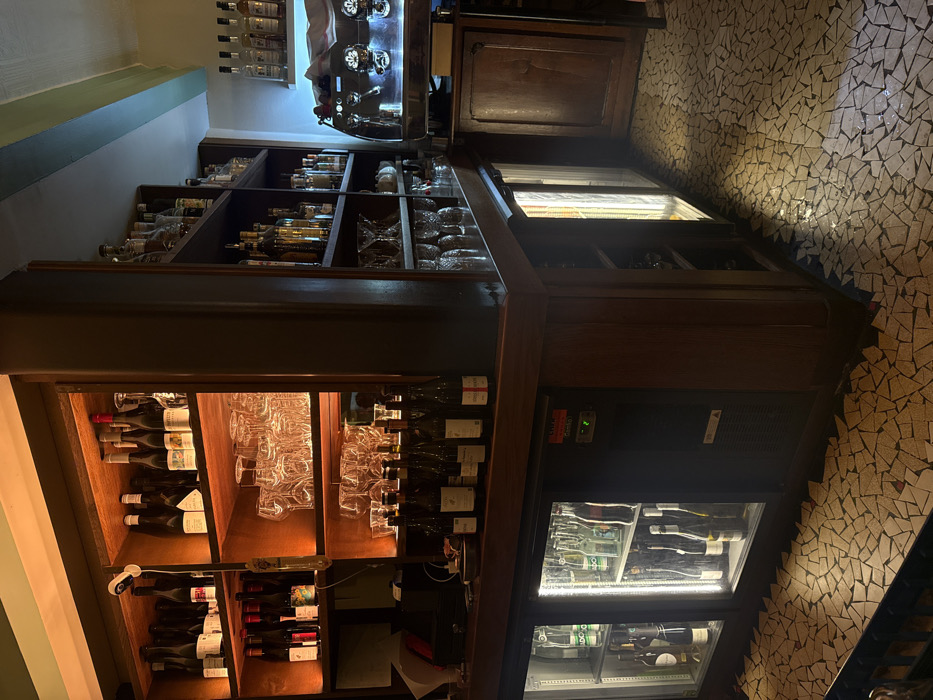 A multi-level bar display showcases glassware, liquor bottles, and wine. Bottles are arranged on wooden shelves, some in a refrigerated unit. Mosaic tiles cover the adjacent wall. The bar includes a closed wooden cabinet at the top. Lighting illuminates the contents.