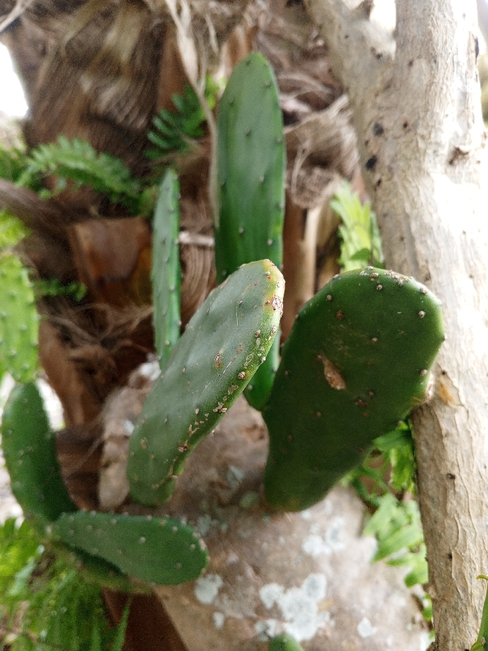 The image displays a close-up of a cluster of green prickly pear cactus (Opuntia) pads growing outdoors in Ciherang, Indonesia. Multiple cactus paddles of varying sizes and shapes are visible, characterized by their flat, broad, and somewhat elliptical forms, with small, raised light-colored areoles distributed across their surfaces. One paddle prominent in the mid-ground exhibits a slightly yellowish or brownish discoloration along its top edge, while another to its right features a small brown lesion. The cactus is situated in front of a natural background. Immediately behind the cactus, a large, dark-brown, fibrous tree trunk, consistent with a palm tree, is discernible. Interspersed with this trunk and extending to the left and rear are sections of green, fern-like foliage. To the right, a lighter-colored, vertical tree trunk or branch, grayish-tan with darker spots and white lichenous growths, frames the scene. The base of the cactus appears to be rooted in or emerging from a light-colored, possibly concrete or stone, surface that also bears white, mottled deposits. No individuals or dynamic actions are present.
