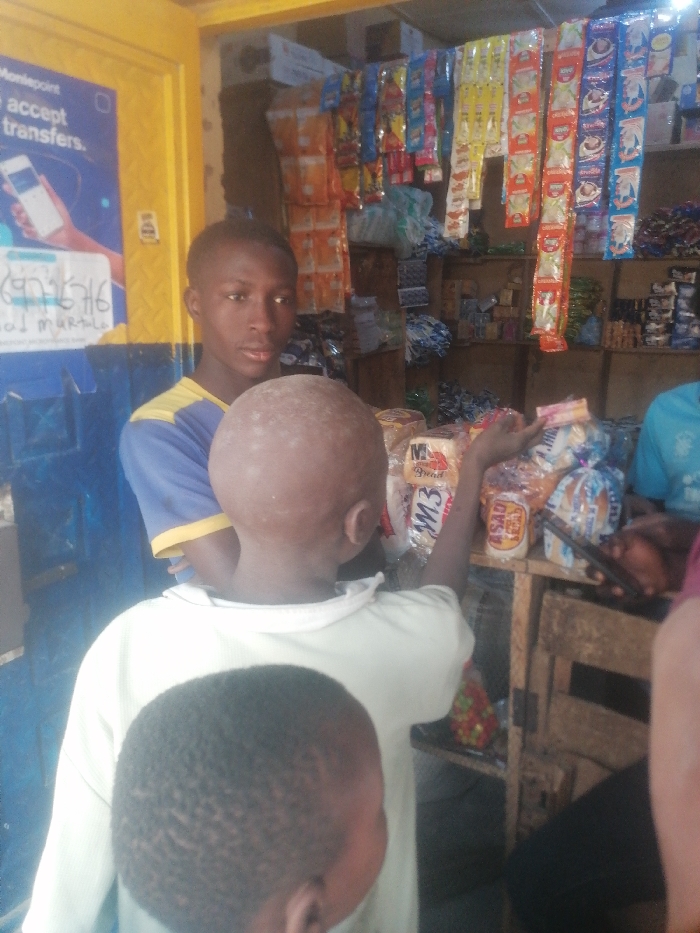 Inside a small shop, a young man in a blue and yellow shirt stands behind two young boys. The boys are looking at items on a shelf filled with bread, snacks, and other goods. One boy is pointing at a product. A mobile money service poster is visible on the shop's side wall. Various snacks are hanging from the ceiling. The scene suggests a common interaction at a local convenience store, potentially in an African setting.