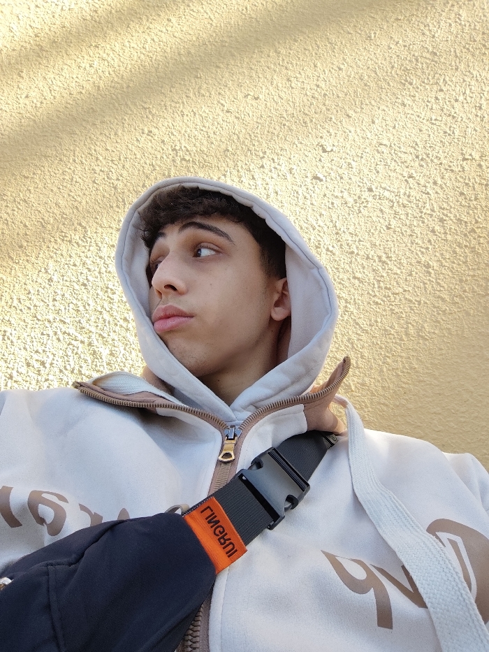 A young man with curly dark hair and light skin wears a cream-colored hoodie with a hood pulled up