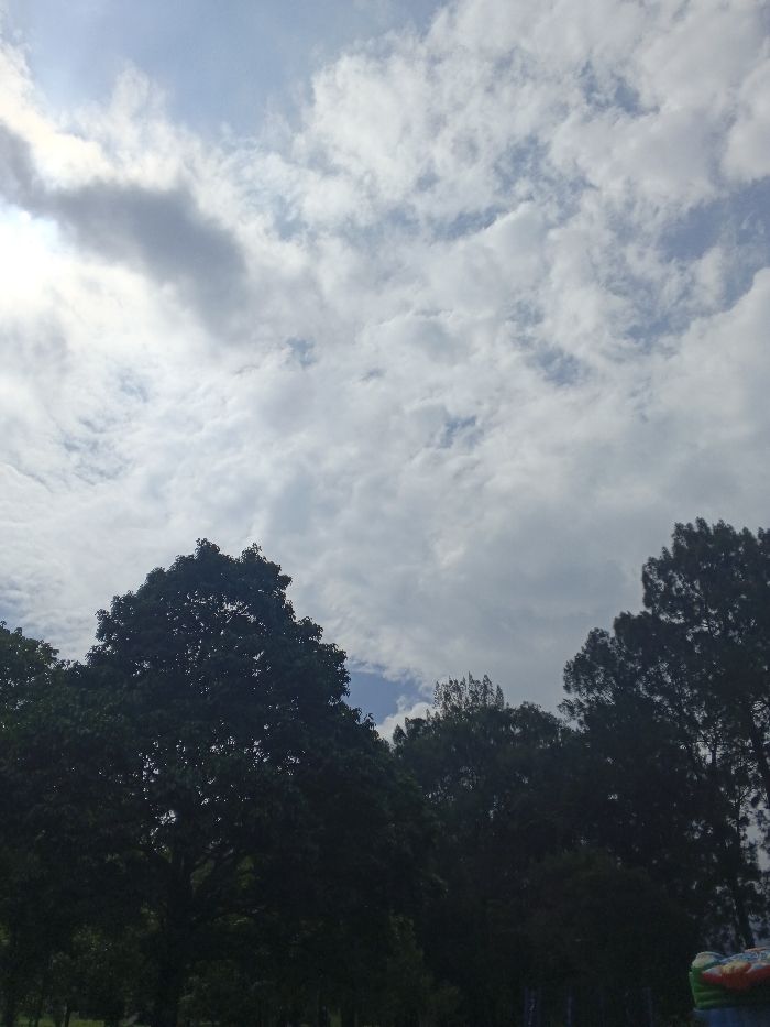 The image displays an outdoor scene in Tapaiteng Uesa, Bhutan, dominated by a cloudy sky above a treeline. The upper two-thirds of the frame show a sky filled with various white and grey clouds, primarily altocumulus and stratocumulus, with visible patches of pale blue sky. A brighter area in the upper left suggests the obscured sun. The lower third of the image is occupied by the dark silhouettes of numerous trees, appearing as dense foliage against the lighter sky. A large, broad-canopied deciduous tree is prominent on the left side of the lower frame. To its right, several coniferous trees with more pointed crowns and needle-like texture are visible. In the bottom right corner, a small portion of a colorful, possibly inflatable, object with red, blue, and green sections is discernible. No people or specific actions are visible.