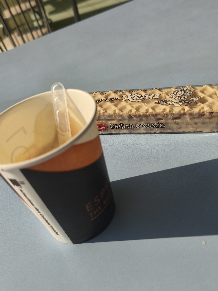 The scene captures a still life on a light blue table surface, illuminated by direct sunlight which casts distinct shadows. Located in Pleven, Bulgaria, the primary subjects are a partially consumed beverage in a disposable paper cup and an unopened packaged wafer bar. The paper cup, positioned on the left foreground, features a black body with an orange band near the top and a white rim. The text "ESPA" and "THE BE" are partially visible on its side, along with "International Hot Content Available." Inside the cup, a light brown liquid with a layer of foam suggests coffee or a similar beverage, and a clear plastic stirring stick is present. To the right and slightly behind the cup lies a rectangular wafer bar, sealed in clear plastic packaging. The packaging clearly displays "Хели" (Heli) and "Вафла с халва" (Waffle with halva) in Cyrillic script, accompanied by graphic elements including sunflowers. The wafer itself appears light-colored with visible layers. No individuals are present in the image.