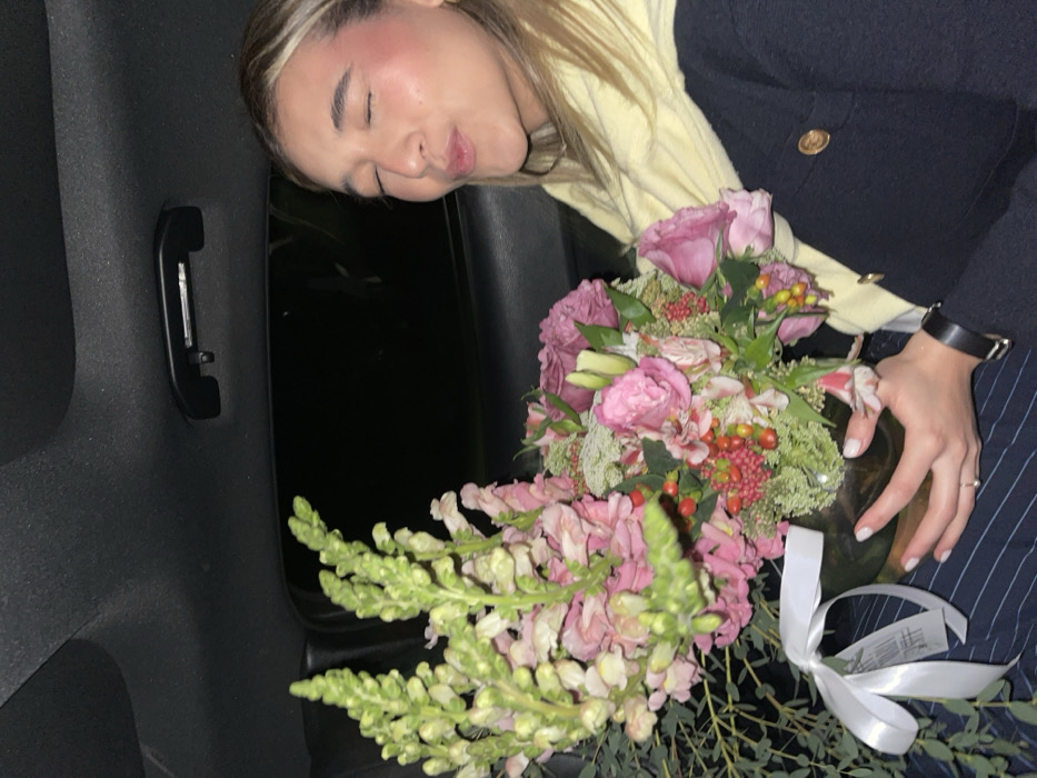 A woman with blonde hair and closed eyes is shown inside a car, holding a large floral arrangement. She wears a yellow sweater under a dark blazer with gold buttons, and a striped skirt. Her hand, adorned with a watch, is visible, holding the vase. The bouquet features roses, snapdragons, berries, and greenery, tied with a white ribbon. The car's dark interior includes a window and a small handle.