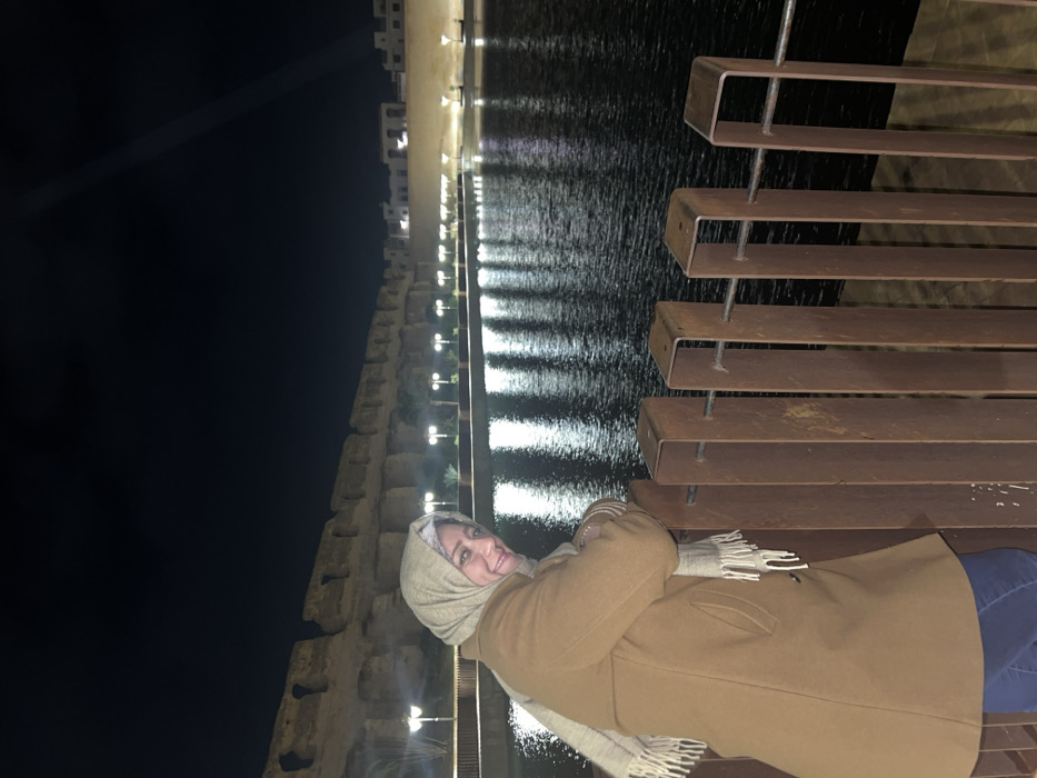 A woman in a tan coat and hijab sits on a slatted bench at night. Behind her, a dark body of water reflects light from a distant structure with evenly spaced lamps. The structure appears to be a waterfront promenade or building with illuminated pathways. The sky is dark, and the overall scene is dimly lit, creating a serene yet mysterious ambiance.