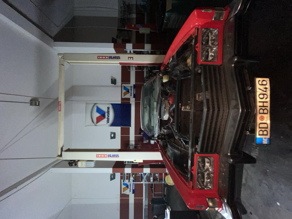 The scene depicts an interior view of an automotive repair workshop in Podlastva (Poljice), Montenegro. A large, red classic American convertible car, with its hood open, is centrally positioned on a dark concrete floor. The car's front features a prominent chrome bumper, a dark horizontal grille, and rectangular headlight assemblies, each containing two circular projector-style lights. A Montenegrin license plate, "MNE BD BH946," is affixed to the front bumper. The engine bay is exposed, revealing various components, including a visible red air filter housing. The car's interior, visible through the windshield, appears to be a light color. In the background, a beige two-post Stertil-Koni car lift, marked with "5000 kg" capacity on its crossbeam, is in a lowered position. The workshop walls are white, adorned with a horizontal pattern of alternating red and white stripes. Multiple Valvoline brand banners and logos are displayed on the walls, including a large vertical blue and white banner centrally located, flanked by smaller horizontal ones. Overhead and wall-mounted light fixtures illuminate the area. A person wearing a dark blue or purple garment is partially visible behind the driver's side of the red car. To the left, shelving units with various objects are discernible, and a yellow object rests on the floor. A portion of another dark vehicle is visible in the background on the right.