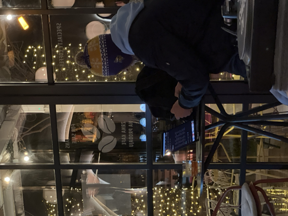 Inside a café, a person wearing a blue and yellow knit hat is using a tablet. The cafe's window has a decorative coffee bean design and the words "ZRNA KAFE" and "ZA PRODAJU". The scene is lit by fairy lights. The person is wearing a dark blue jacket and is seated. The tablet displays what appears to be code or data, with many lines of text.