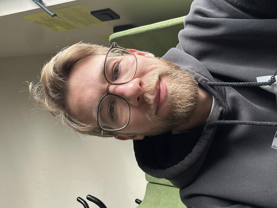 A male individual is depicted in a close-up, chest-up portrait shot, appearing to be a selfie. The subject is an adult male with fair skin, light blonde hair slightly disheveled at the crown, and a full, neatly trimmed blonde beard and mustache. He wears round, translucent brown-framed eyeglasses. His expression is neutral with a slight closed-lip smile. He is dressed in a dark grey hooded sweatshirt with a visible drawstring and a white undershirt visible at the collar. The background is an indoor setting with light-colored walls. To the subject's left, a portion of a tall, green upholstered chair and a black multi-pronged coat rack are visible. To the subject's right, another section of a similar green upholstered chair is present, along with several yellow papers affixed vertically to the wall and a dark wall-mounted panel below them. The specific location within the city of Budva, Montenegro, is not discernible from the visual information provided in the image.