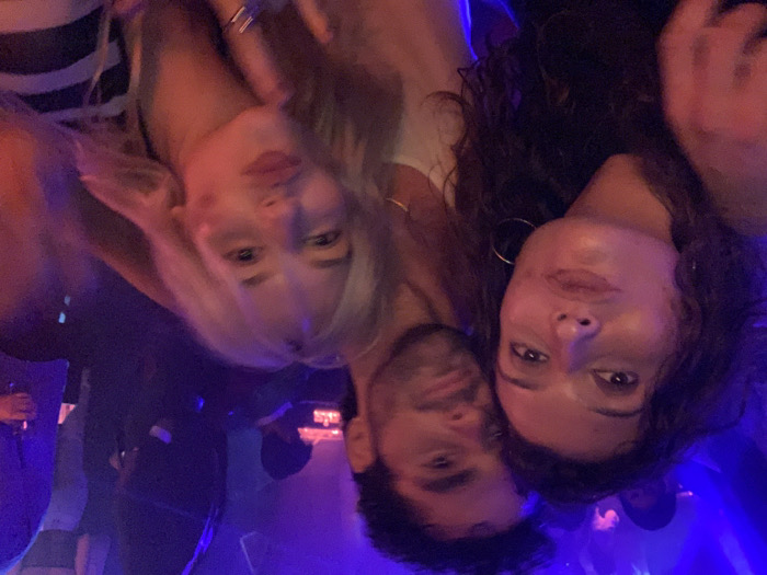 The image depicts three individuals in a dimly lit nightlife establishment within Mexico City. The environment is characterized by predominant blue and purple artificial lighting. On the left, a female with dark, curly hair and a dark top is visible, posing with pursed lips. Her left arm is around the central male figure, who has dark hair, a beard, and wears a white tank top, looking directly at the camera. To the right, a blonde-haired female in a striped top is making a kissing face towards the camera. All three subjects are in close proximity. The background shows blurred forms of other patrons and ambient club lighting.