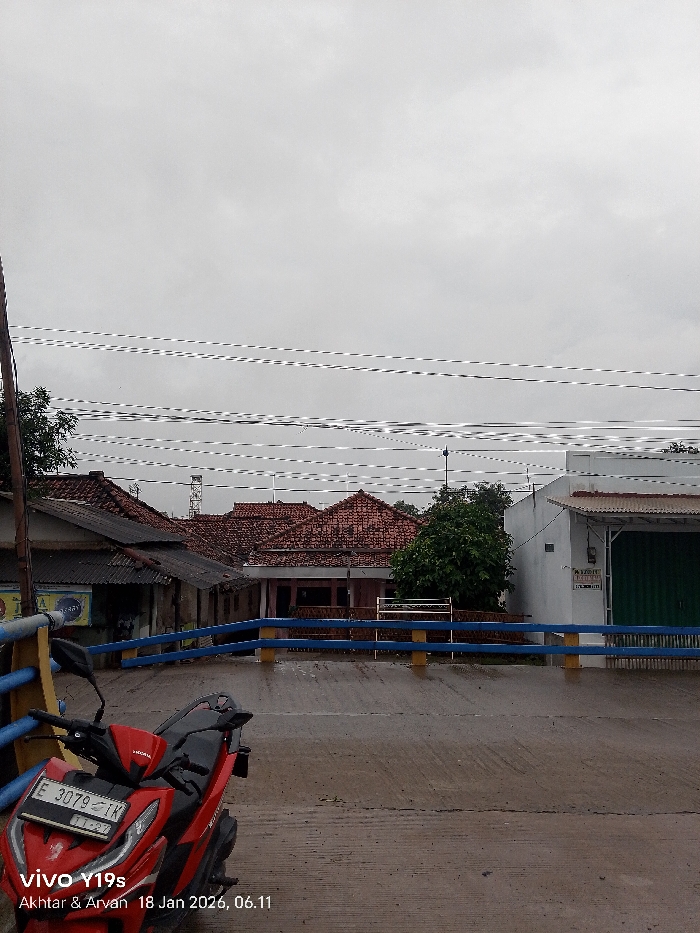 A red Honda motorcycle is parked on a wet road. Houses with red tile roofs and a building with a green door are in the background. A blue and yellow railing runs across the road, likely a bridge. Power lines stretch across the overcast sky. The photo was taken on January 18, 2026.