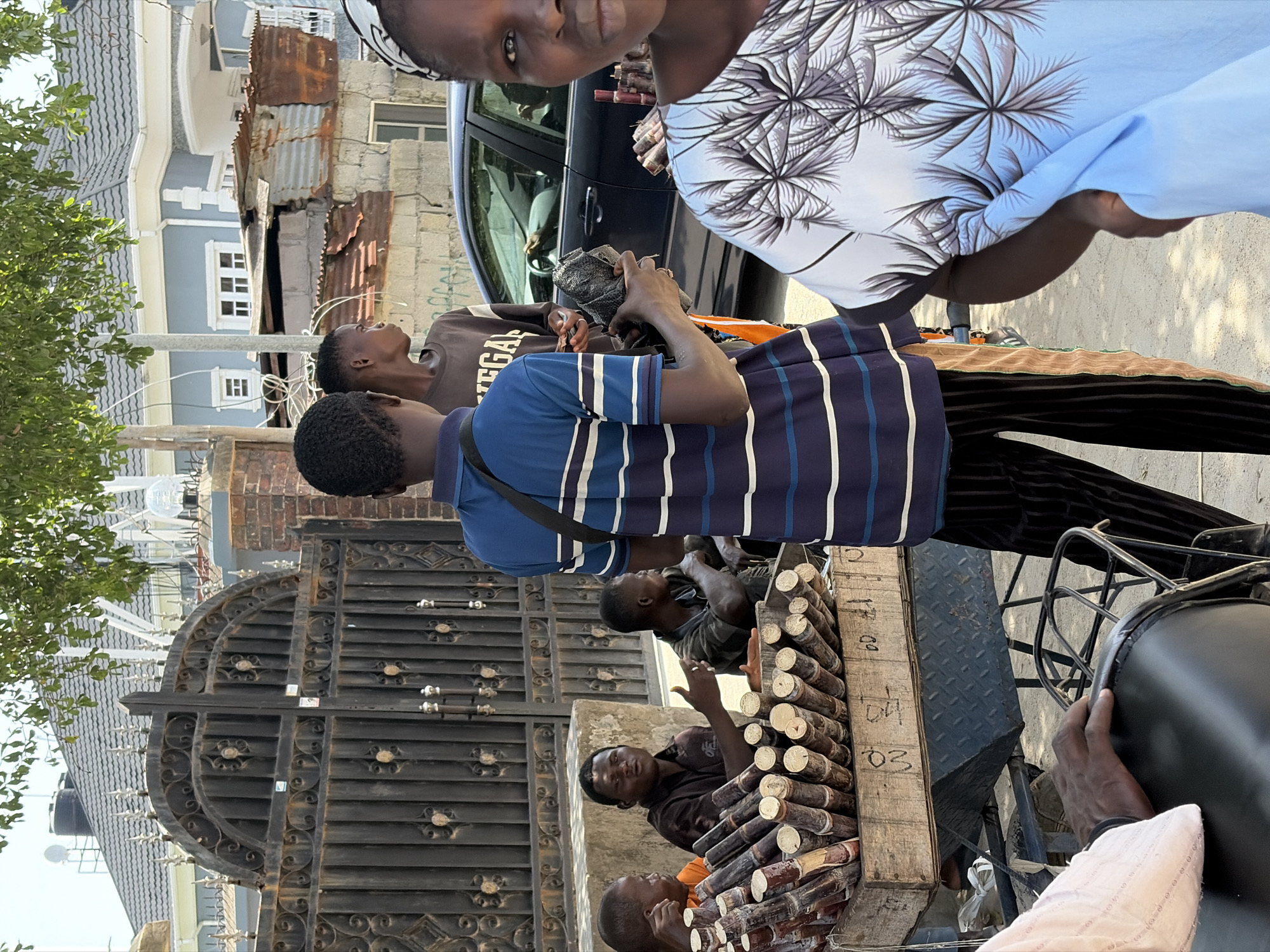 In Igboefon, Nigeria, a group of people are interacting around a cart laden with what appears to be sugarcane. The cart, made of wood and metal, is labeled with numbers. A man in a blue and white striped shirt is holding a black object, possibly a bag containing money. Other individuals stand around the cart, seemingly engaging in commerce. The background includes buildings, a decorative metal gate, and a black car.