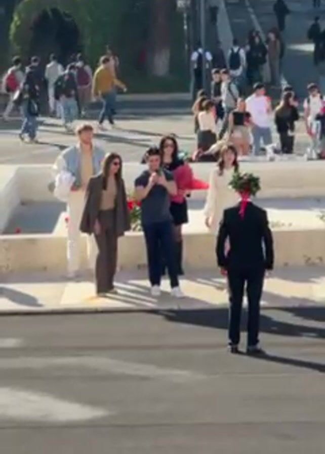 group of people standing on a white platform next to a city street with a pedestrian walkway. Several people are walking in the background, and there is a green arched trellis to the left. Among the group on the platform, a person in a dark suit is facing away from the camera, wearing what appears to be a wreath on their head with a red ribbon. Several other people in the group are facing the camera; one is holding a phone, seemingly taking a picture. Two people in the middle are holding what looks like a red bouquet of flowers. The setting appears to be outdoors during the day.