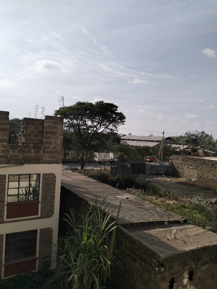 A two-story brick building occupies the foreground. Beyond it, a corrugated metal structure extends towards a road. A large tree stands in the middle distance, with a warehouse or industrial building visible further back. A pickup truck is seen on the road. The sky is overcast, and vegetation surrounds the structures, adding to the rural or semi-urban feel of the scene.