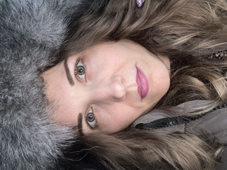 A close-up portrait shows an adult female looking directly at the viewer. She has light brown or hazel eyes and wears pink lipstick. Her hair is long, wavy, and brown with blonde highlights. She is wearing a grey, furry hood or hat that frames her face, indicative of a winter jacket, a portion of which, with a visible black zipper and mesh, is seen on the left. A dark, possibly patterned garment is visible near her neck on the right. A fingernail with purple glitter polish is partially visible on the right side. The background is dark and indistinct. The scene is located in Aidemir, Bulgaria.