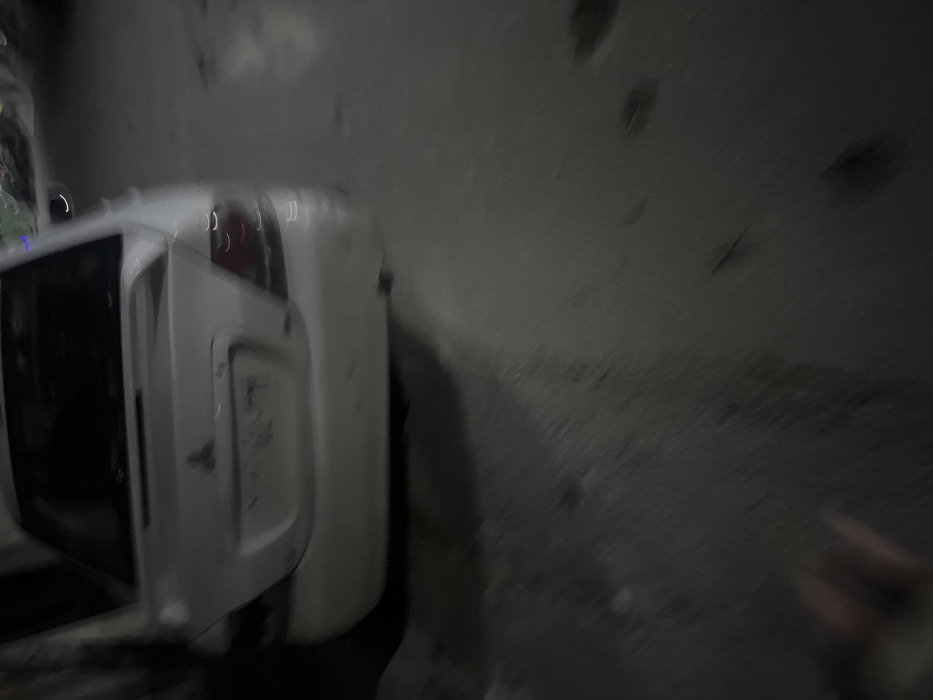 A blurry, low-light image depicts a white car with an open door on an asphalt surface. The car appears to be slightly damaged and the asphalt has debris. The image is taken at an odd angle, giving the impression that the car is tilted or flipped. Overall, the picture is dark and indistinct, making it challenging to discern finer details.