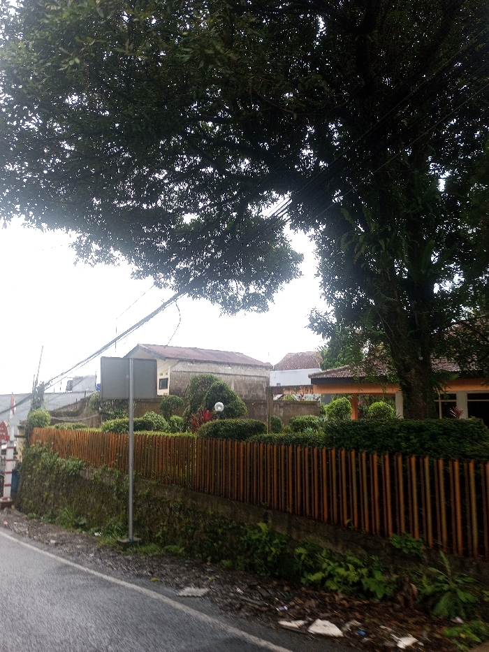 A street view features a roadside scene. A brown, picket-style fence lines the property, behind which lie neatly trimmed hedges and bushes. Buildings, including a house with an orange roof, are visible in the background. Lush green trees and overhead wires occupy the upper portion of the image, partially obscuring the sky. The pavement borders the scene's lower edge, marked by some debris. The light suggests an overcast day.