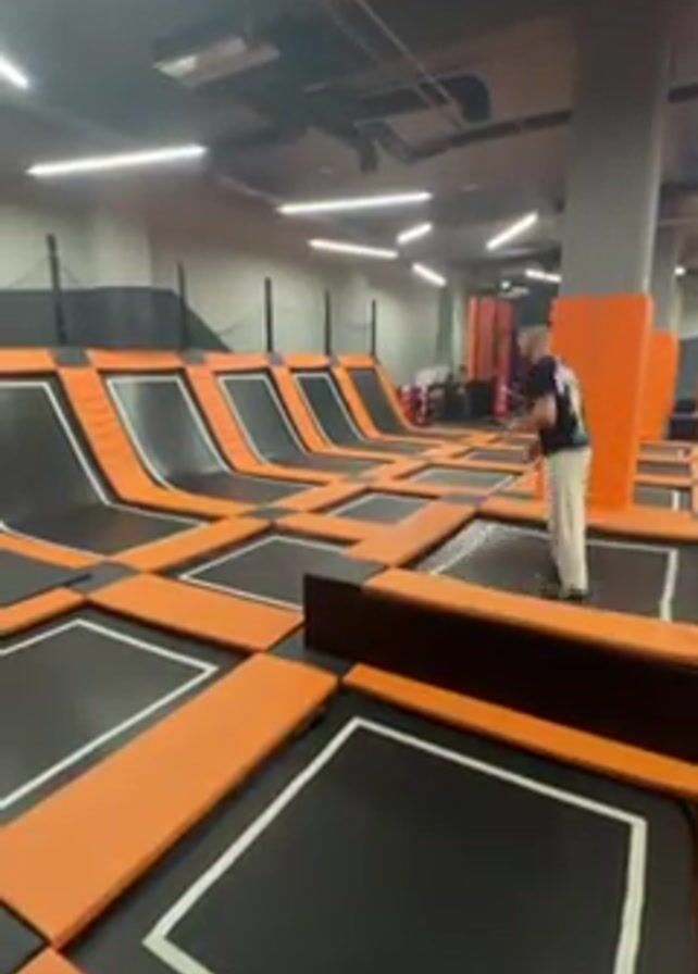 A man is at a trampoline park, which consists of multiple interconnected trampolines with orange padding