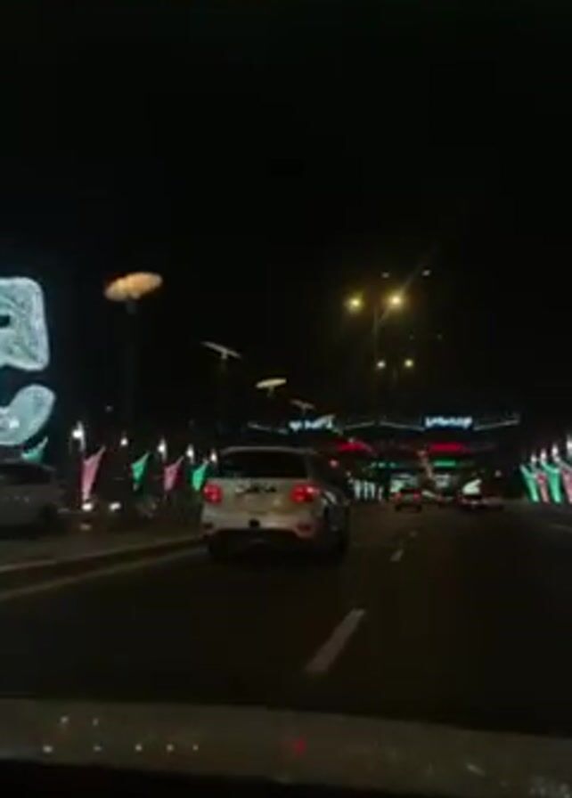 night scene of cars driving on a road adorned with lights. The camera is positioned inside a car, looking out through the windshield. The main focus is on the road ahead, where other vehicles are traveling. Bright streetlights illuminate the road. Decorations, likely for a celebration, are visible in the background, featuring green and red lights. There is a large green sign with white lettering in what appears to be Arabic script spanning the road. The environment is dark except for the bright lights.