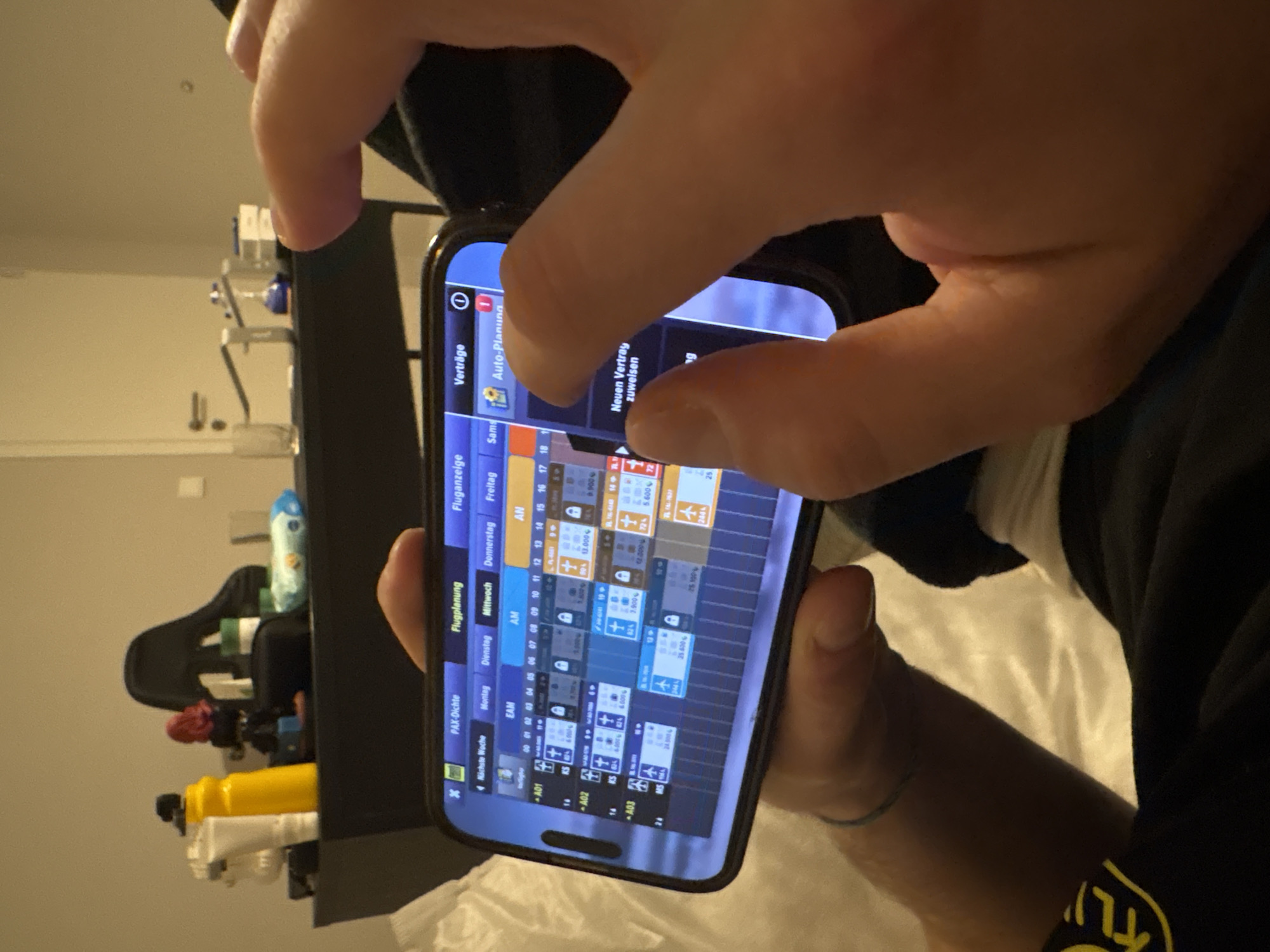 The image depicts an indoor scene, likely a residential room, situated in Mönchengladbach, Germany. A person, visible from the chest down, is reclining or seated, wearing dark trousers with a partially visible yellow "KL" logo on the left leg, and white socks. A white bedsheet or duvet is visible beneath the person's left arm. The individual holds a black smartphone horizontally with both hands. The right arm and hand are visible, with a blue string bracelet on the wrist. The left hand's fingers are actively interacting with the touchscreen. The phone's display shows a German-language application, identified by tabs for "PAX-Dichte," "Flugplanung" (Flight Planning), "Fluganreise," and "Verträge" (Contracts). The "Flugplanung" section presents a grid-based schedule with days of the week (Montag to Samstag) and time slots (EAM, AM, AN), populated with airplane icons, numeric values, percentages, and monetary figures related to various flight assignments (e.g., A01, A02, A03). The "Verträge" tab, partially obscured by the left hand, displays options such as "Auto-Planung" (Auto-Planning) and "Neuen Vertrag zuweisen" (Assign New Contract). In the middle ground, a dark, flat surface serves as a table or shelf. On its left side, a white squeeze bottle, a yellow water bottle with a black cap, a small figurine with red hair and dark clothing on a blue base, a black pouch, and a blue package of wipes are arranged. On the right side of the surface, a clear drinking glass, a silver-colored object (possibly a lamp component), a small blue bottle, and stacked white rectangular items are present. The background features a light-colored wall with a white door equipped with a silver handle on the right side, and a small white light switch located to the left of the door.