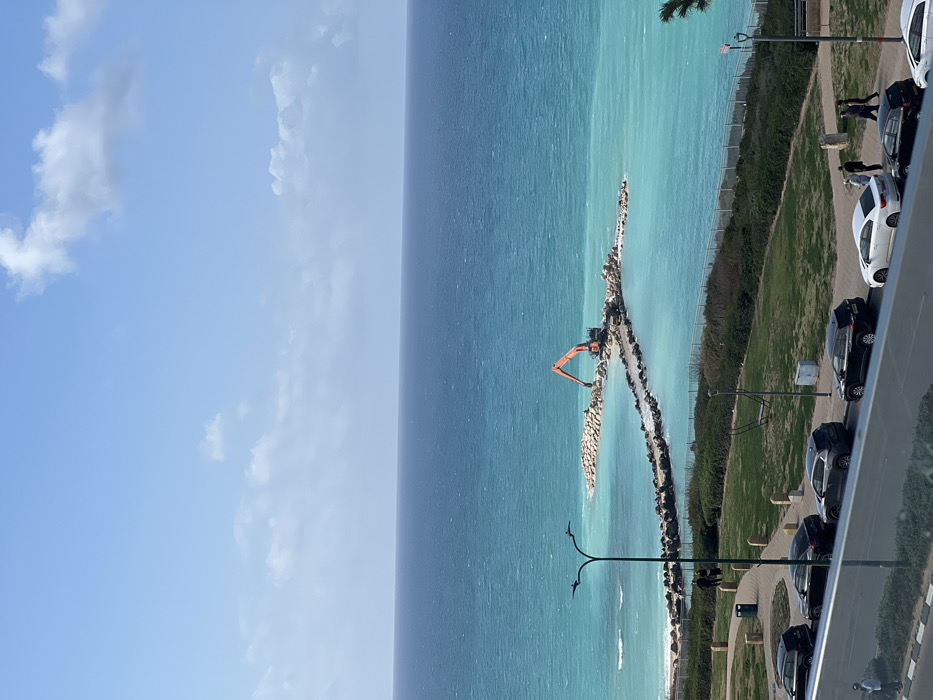 This image captures a daytime scene along the Mediterranean coast in Netanya, Israel, viewed from an elevated perspective