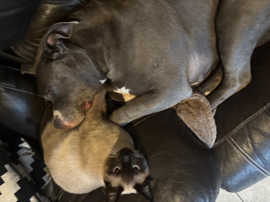 This image depicts an indoor scene within the city of Esch-sur-Alzette, Luxembourg. A cream-colored Siamese-type cat with dark brown points on its face, ears, paws, and tail is positioned on its left side, facing the camera with open, light-colored eyes. Its right front paw is resting on the flank of a large, short-haired, dark grey/blue dog. The dog, which appears to be a Pitbull-type, has white markings on its chest and is lying on its back or right side, with its head turned away from the camera. A reddish area is visible on the dog's muzzle. Both animals are resting on a dark brown or black leather sofa featuring prominent white stitching. A black and white geometric patterned cushion or blanket is partially visible in the upper left corner, and a light-colored tiled floor is visible in the lower left foreground.
