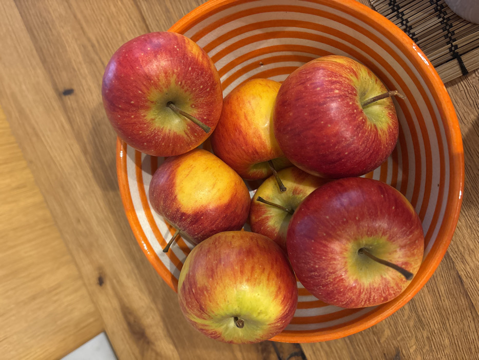 - "An overhead view captures a ceramic bowl containing eight apples, situated on a light wooden surface" by FM-2VH5m1, licensed under CC BY 4.0