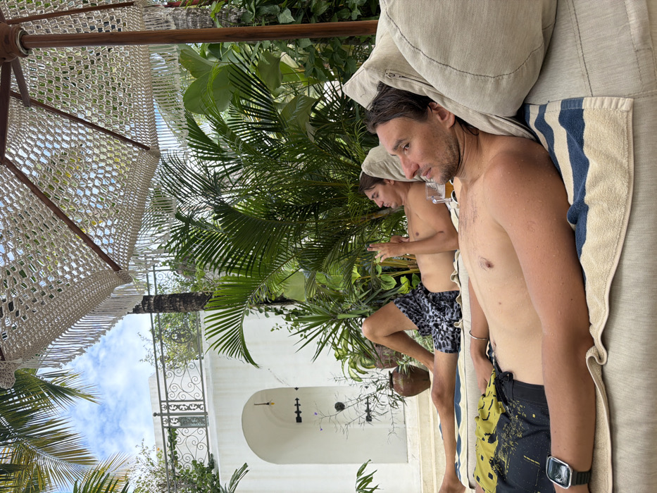 Two shirtless men relax on a cushioned lounge chair outside. One man, older, is closer to the camera with a watch on his left wrist. The other, younger, is further back with a towel on his head and holding a phone. Palm trees and tropical foliage surround them, with a decorative white wall and an arched shower feature visible in the background. A fringed umbrella provides shade above.