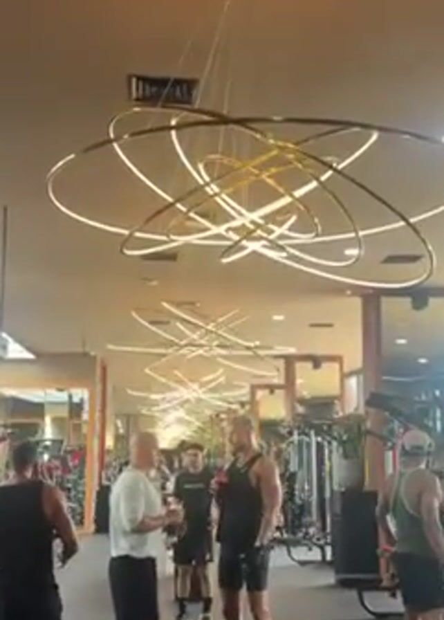 The video depicts the interior of a gym, with a focus on the ceiling. The ceiling features a series of modern, circular light fixtures, arranged in a layered, overlapping pattern. In the background, people are visible, some standing and talking while others appear to be working out. The gym equipment is visible in the background too. The overall atmosphere is that of a modern and well-lit gym environment.