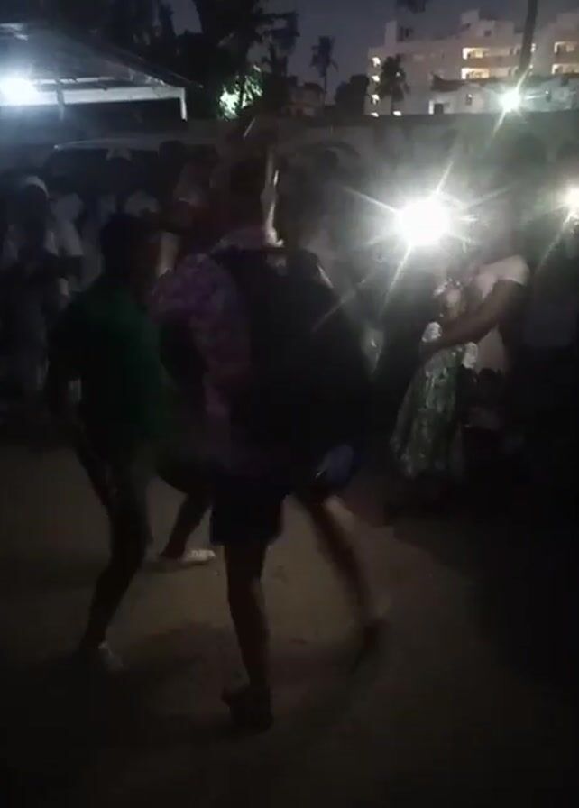 group of people dancing outdoors at night. The lighting is poor, but some handheld lights are being used, creating bright spots. Most of the people appear to be young adults, and they are dancing in a group. There's a building or structure in the background, along with a vehicle, likely a van, parked to the side. It appears to be a lively, festive gathering.