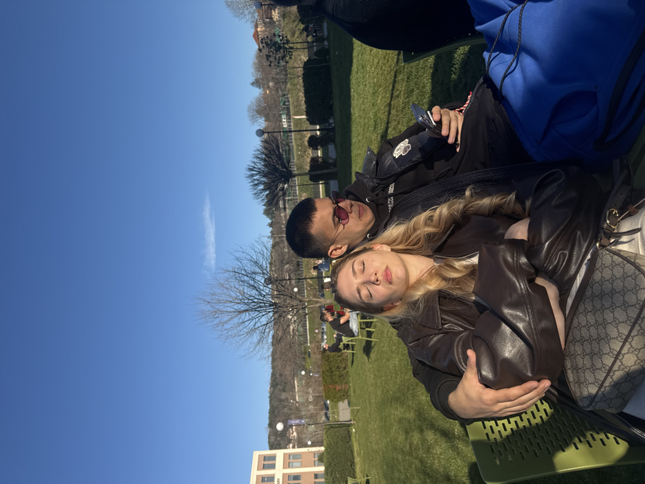 Two young adults are seated on a light green slatted bench outdoors, positioned in the foreground of a scene on the campus of the American University in Bulgaria (AUBG) in Blagoevgrad