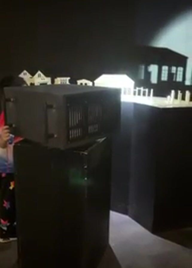 A child stands in front of a black box with a barred front, resting on top of another black box. Behind the boxes is a model of houses, some illuminated with white light. The room is dark. The child is wearing colorful pajamas with stars on them. The model houses are various sizes and shapes. A projection of a larger house is visible on the black wall behind the model. The child appears to be looking closely at the box in front of them.