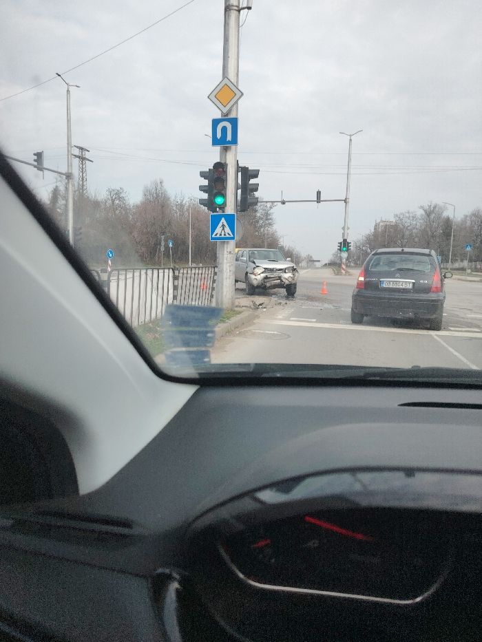 A vehicular accident scene at an urban intersection in Lovech, Bulgaria