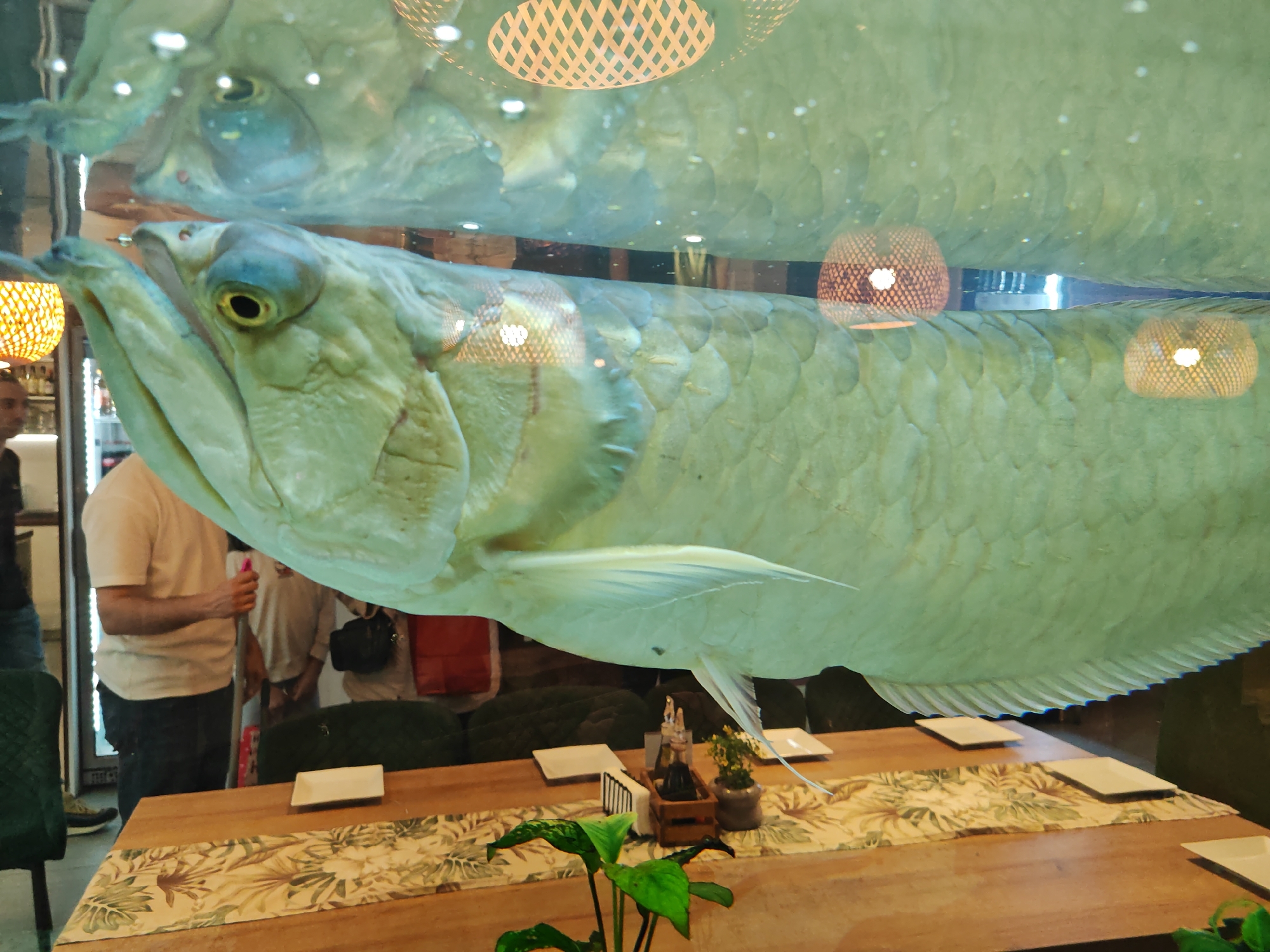large, silver-colored arowana fish swimming in an aquarium. The aquarium is positioned above a restaurant table setting. The table has a decorative runner with a floral pattern, plates, condiment containers, and a small plant. People are standing in the background, near the side of the fish tank. The lamps and interior design indicate the location to possibly be a restaurant in Sofia, Bulgaria.