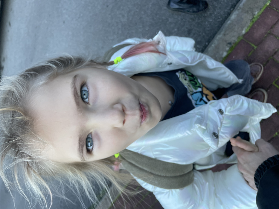 A young girl with striking blue eyes and blonde hair looks up at the camera. She wears a shiny white puffer jacket over a dark t-shirt. A green hair tie is visible in her hair, along with a strand of pink. A person's hand is clasped with hers in the lower right corner of the frame. The background includes a section of sidewalk and a brick path.