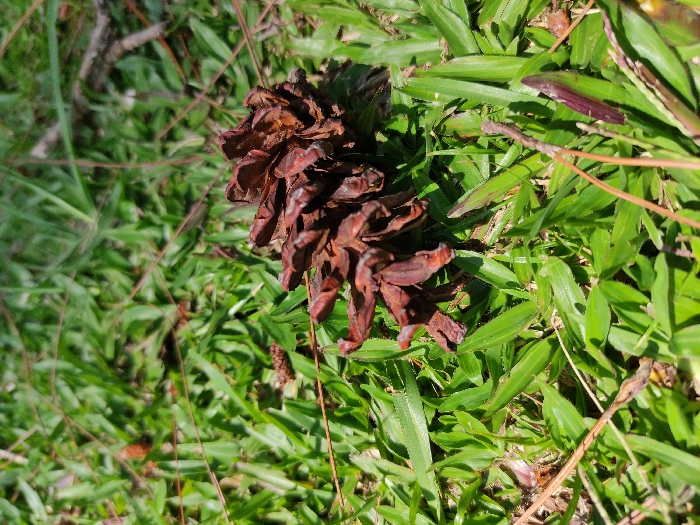 - "A single, dark brown, dried pine cone rests on a bed of vivid green, short-bladed grass" by FM-sO6Wu2, licensed under CC BY 4.0