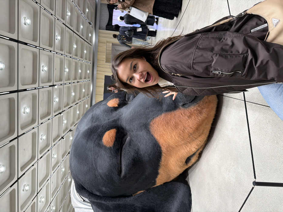 The image depicts an indoor scene at the Kukje Gallery in Jongno-gu, Seoul, South Korea. The primary subject is a large-scale sculpture of a sleeping black and tan Dachshund dog, identified as "A. Lot (Dog)" by artist Alex Da Corte, positioned on the left and center of the frame on a light-colored floor. A young adult female, with brown hair and light skin, is in the lower right, squatting or kneeling next to the dog sculpture. She is looking directly at the camera with an open mouth and wide eyes, expressing surprise or excitement. She wears a brown quilted bomber jacket with a visible white fleece lining, light blue jeans, and carries a beige shoulder bag bearing a Prada logo. Her right hand is extended towards the dog sculpture. In the blurred background, several other individuals are present in the gallery space, some observing exhibits. A black rope barrier with stanchions is visible in the lower left foreground. The ceiling features a grid of square coffers, each containing a recessed circular light fixture.