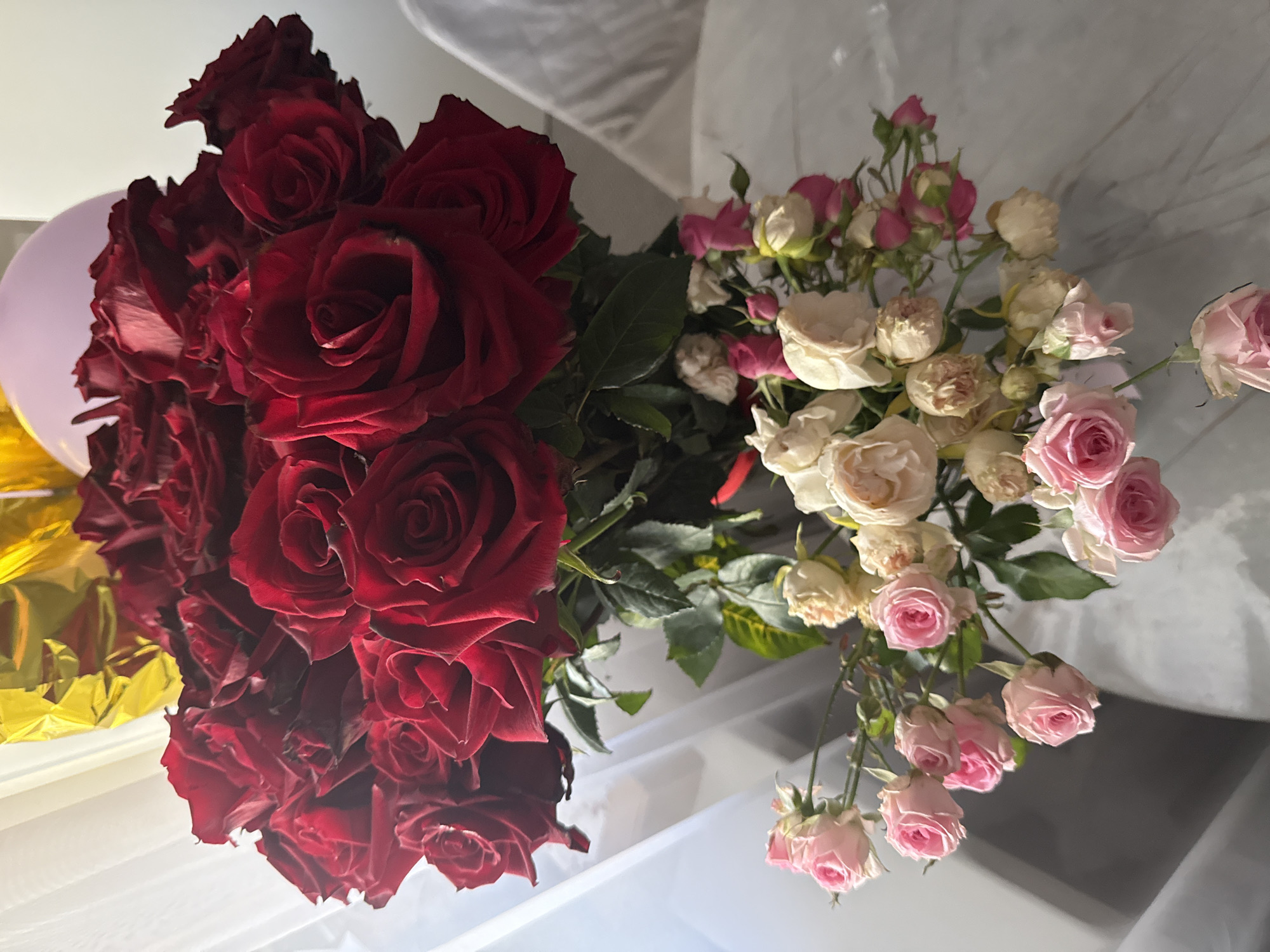 The scene depicts two bouquets of roses displayed indoors in Bol'shie Mkhi, Russia. A large bouquet of approximately two dozen deep red roses occupies the upper half of the frame. Behind the red roses, a gold foil balloon and a light pink balloon are partially visible. Below the red roses, a second bouquet consists of numerous miniature roses; these include vibrant light pink roses and paler, cream-colored or pale yellow roses, some of which show signs of wilting. The flowers are positioned on a light-colored, possibly patterned, surface. The background on the left features a white translucent curtain, while the background on the right is an indistinct light-colored surface, possibly fabric or a wall. No individuals are present in the image.