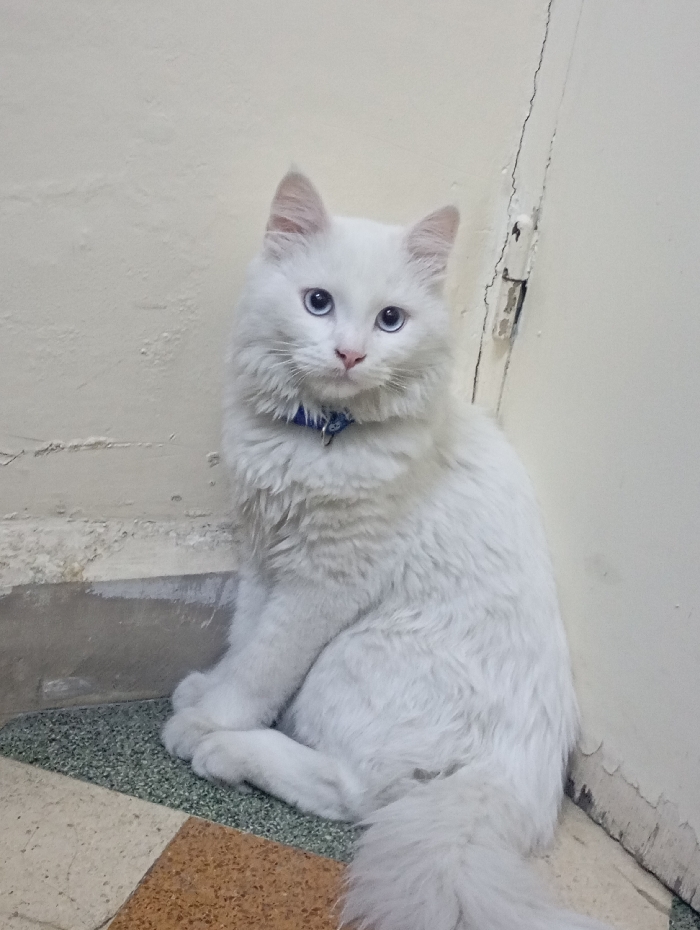 - "A white, long-haired domestic cat with blue eyes and a pink nose is depicted sitting upright in the corner of a room within Joubar Municipality, Syria" by FM-uNgLB2, licensed under CC BY 4.0