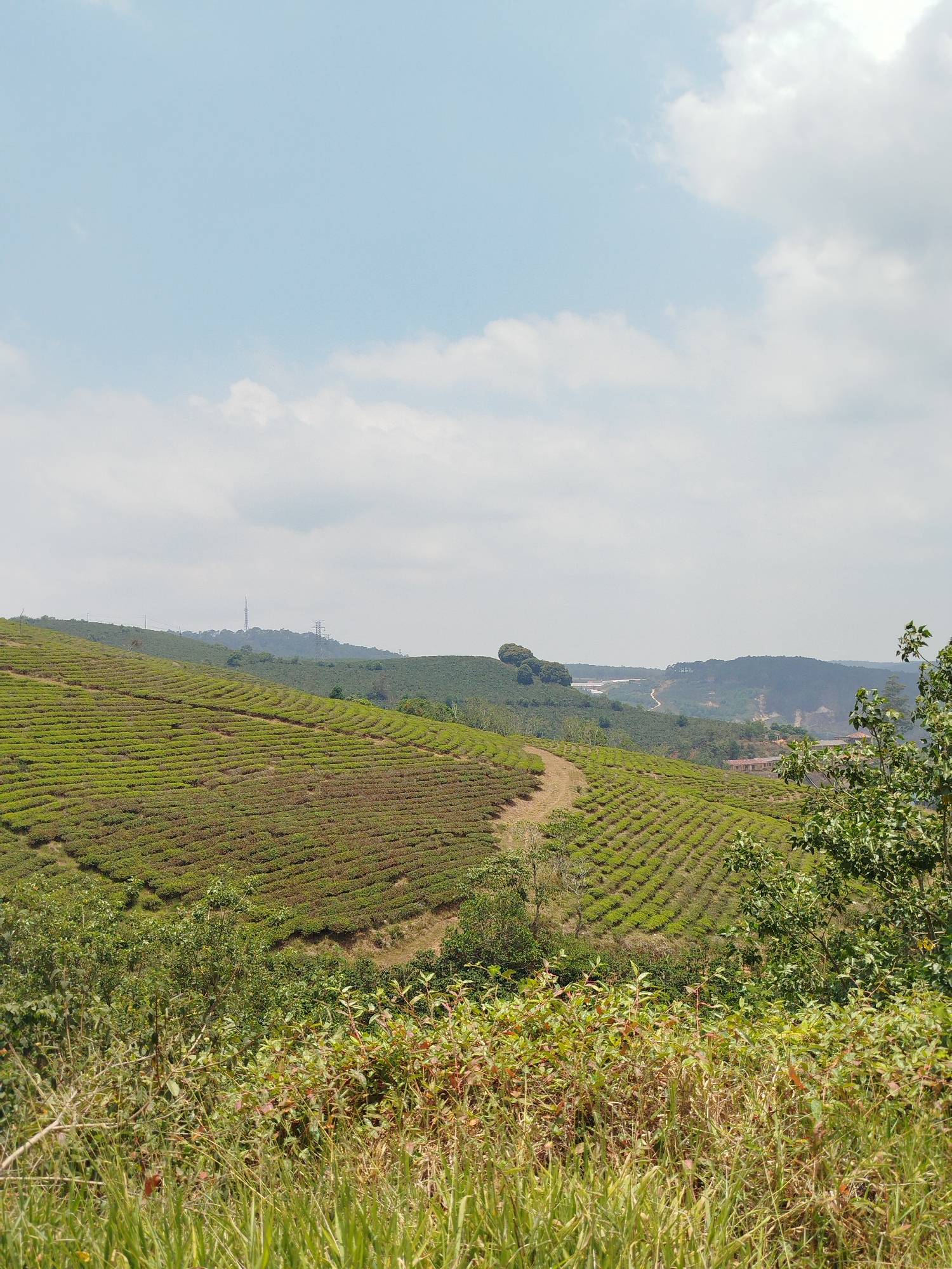 The image depicts a rural landscape in Trường Thọ, Vietnam, characterized by terraced tea plantations on a hillside. The sky is light blue with scattered white clouds. The tea plants are arranged in neat, parallel rows that contour the hill, creating a pattern of green and brown. A dirt path winds its way through the plantation. In the foreground, there is a mix of tall grasses and shrubs. In the midground, beyond the tea plantation, there are more hills and valleys covered in greenery. In the background, an area with powerlines and structures can be seen on another hill. The scene is bathed in sunlight, suggesting a clear day.