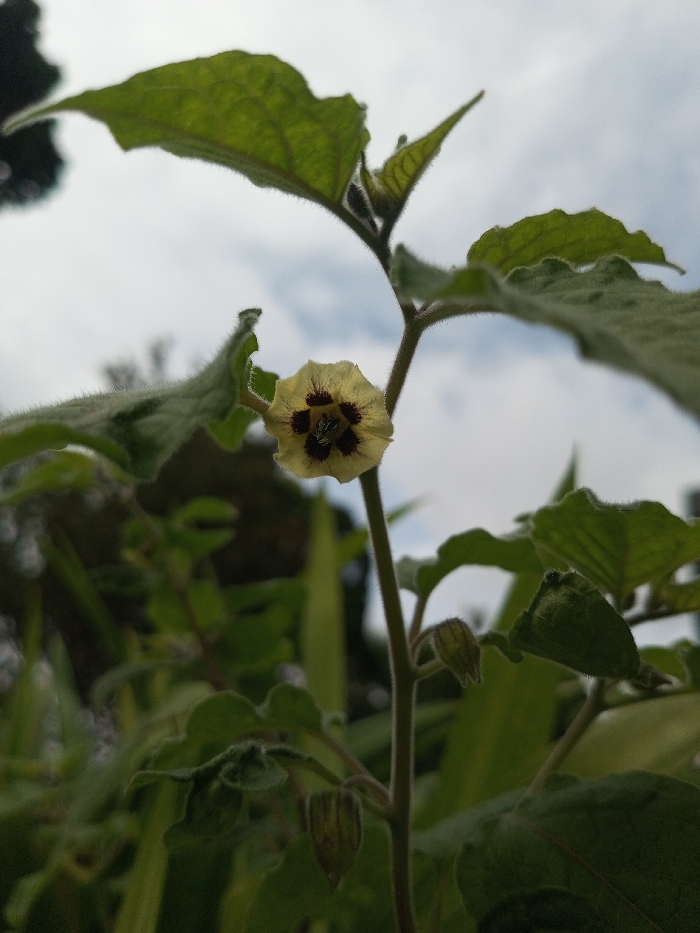 A close-up captures a goldenberry plant against a cloudy sky. Its fuzzy, heart-shaped green leaves frame a pale yellow, star-shaped flower with a dark purple center. Several unripe, enclosed fruit lanterns hang below, still green. The plant's stem and leaves are covered in fine hairs, giving them a soft, velvety appearance.