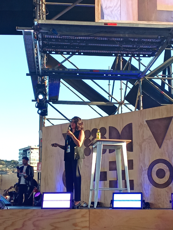 A woman stands on stage, speaking into a microphone. She wears a black outfit, and the background features a wooden wall with geometric shapes. A white stool sits to her right, holding a yellow bottle. Stage lighting illuminates the scene, and overhead scaffolding provides structural support. A man stands to the left, looking at a handheld device. The event appears to be outdoors, set against a bright sky.